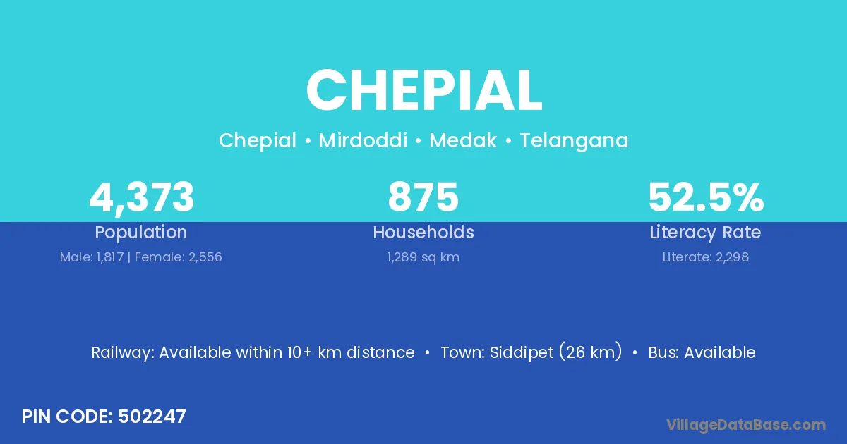 Siddipet (26 km) is the nearest town to Chepial village for major economic activities and is located approximately 26 km away.