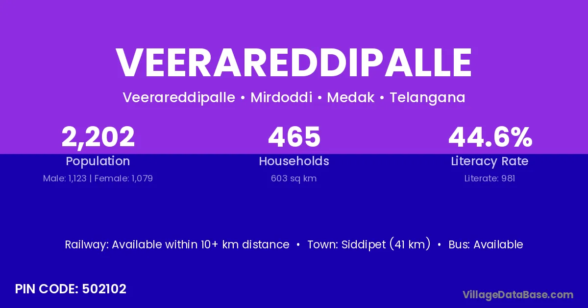 Siddipet (41 km) is the nearest town to Veerareddipalle village for major economic activities and is located approximately 41 km away.