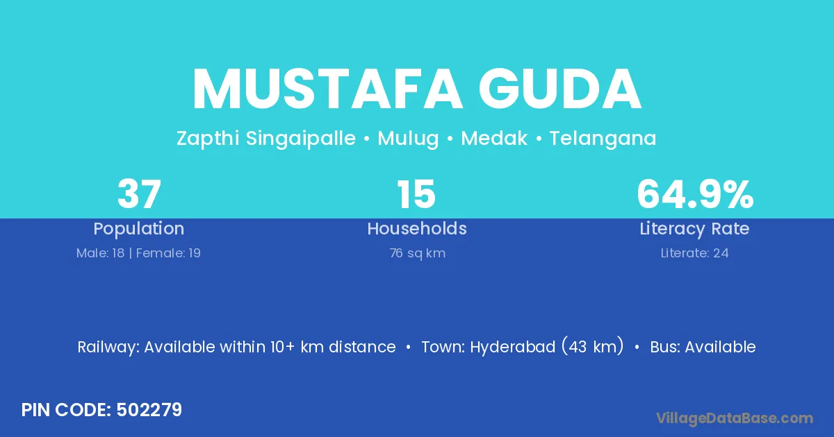 Hyderabad (43 km) is the nearest town to Mustafa Guda village for major economic activities and is located approximately 43 km away.