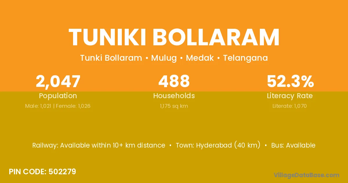 Hyderabad (40 km) is the nearest town to Tuniki Bollaram village for major economic activities and is located approximately 40 km away.