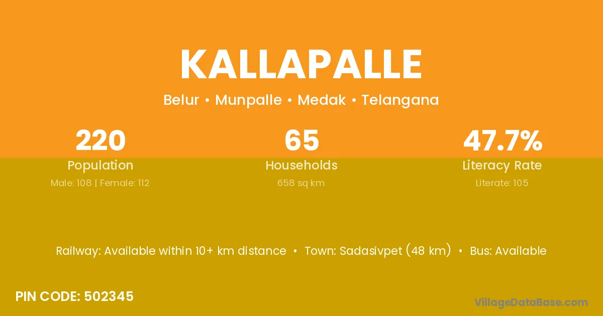 Sadasivpet (48 km) is the nearest town to Kallapalle village for major economic activities and is located approximately 48 km away.
