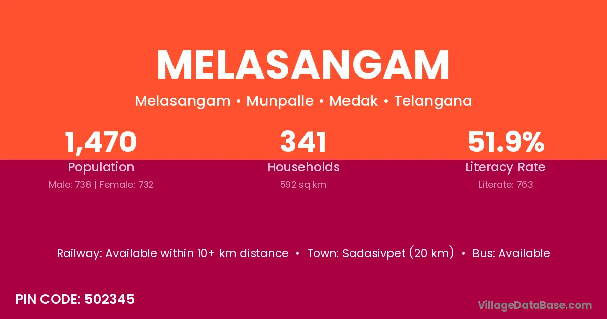 Sadasivpet (20 km) is the nearest town to Melasangam village for major economic activities and is located approximately 20 km away.