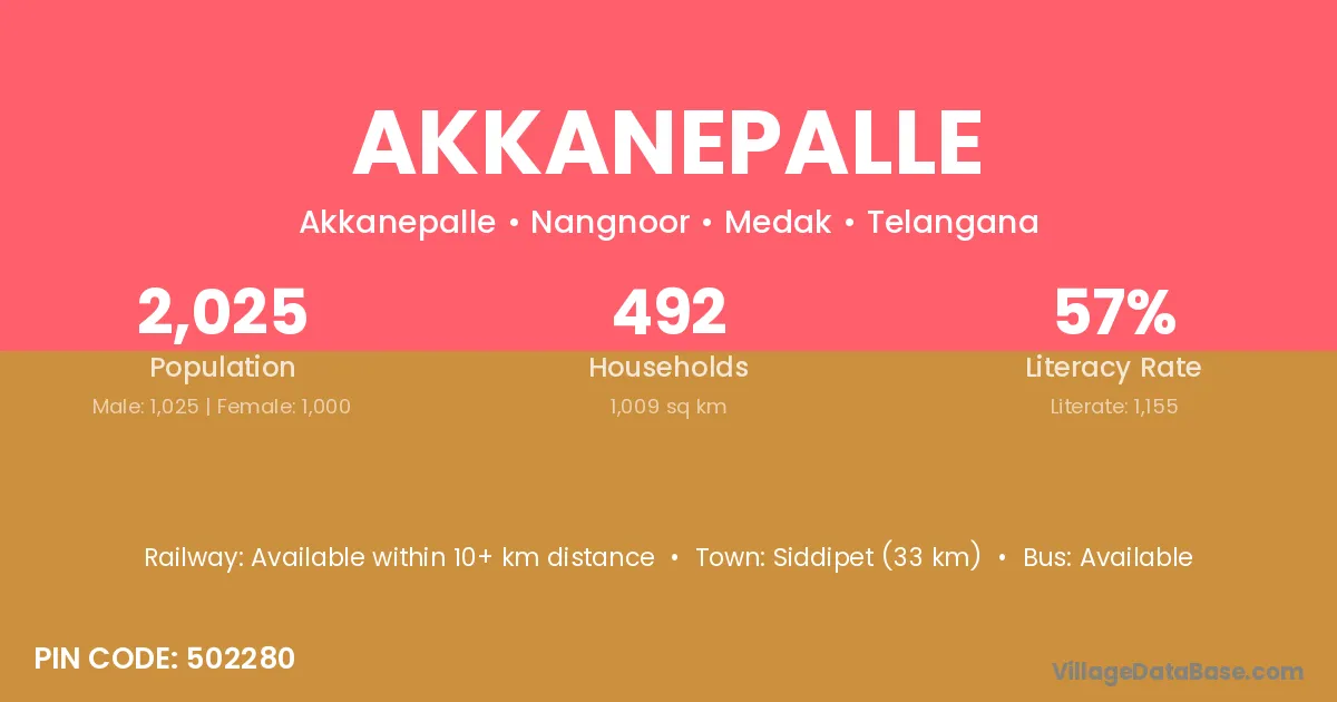 Siddipet (33 km) is the nearest town to Akkanepalle village for major economic activities and is located approximately 33 km away.