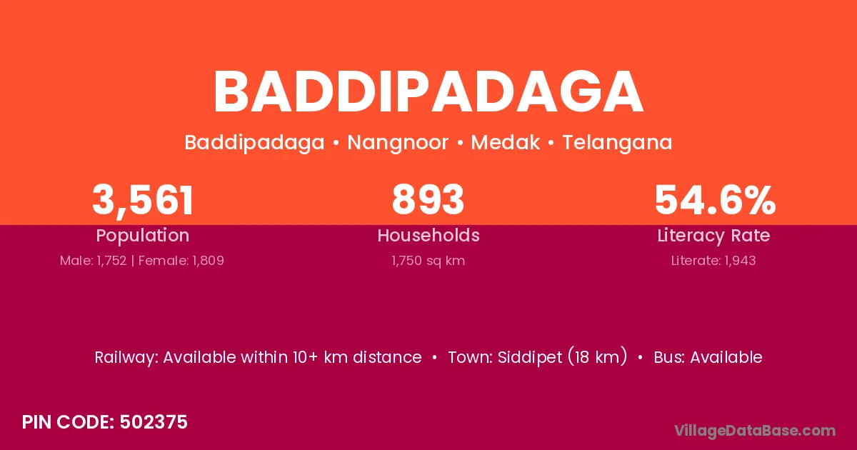 Siddipet (18 km) is the nearest town to Baddipadaga village for major economic activities and is located approximately 18 km away.