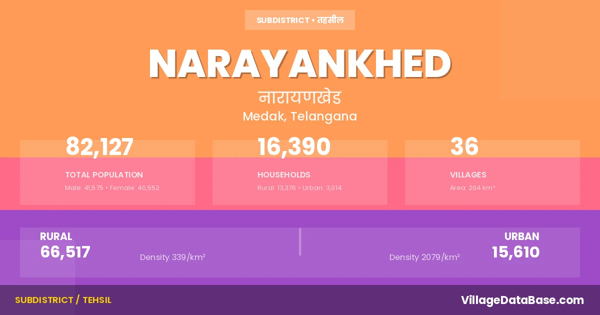 According to the 2011 census The total area of Narayankhed Mandal is 204 km², with a population of 82127 people. The population density is 403 inhabitants per square kilometre, and there are approximately 16390 houses in the sub district.