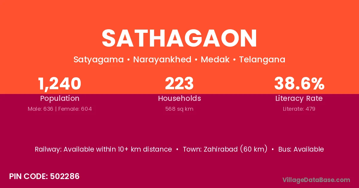 Zahirabad (60 km) is the nearest town to Sathagaon village for major economic activities and is located approximately 60 km away.