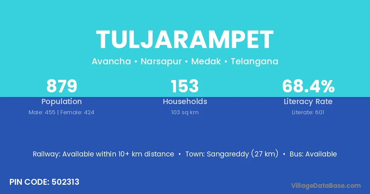 Sangareddy (27 km) is the nearest town to Tuljarampet village for major economic activities and is located approximately 27 km away.
