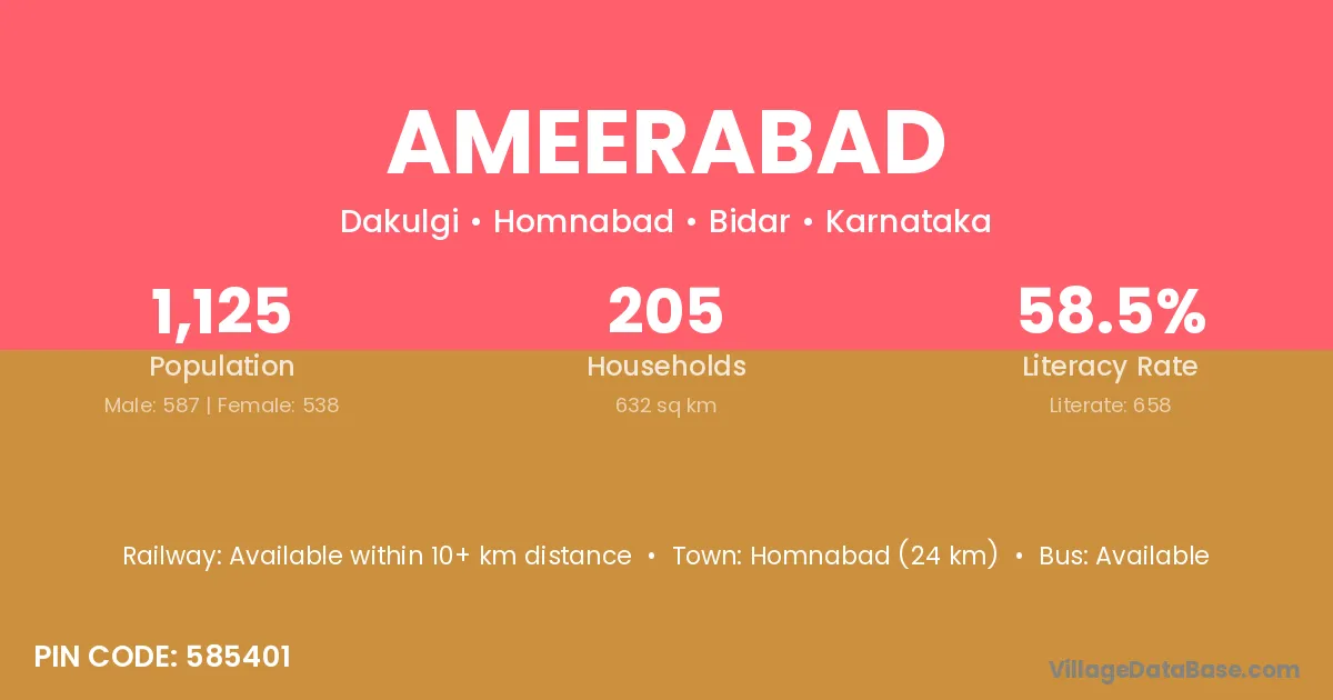 The literacy rate of Ameerabad village is 42.77%. Male literacy stands at 54.31% and female literacy at 32.97%.