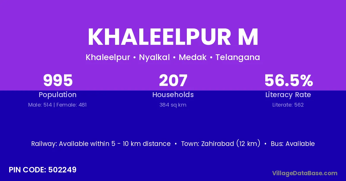 Zahirabad (12 km) is the nearest town to Khaleelpur M village for major economic activities and is located approximately 12 km away.