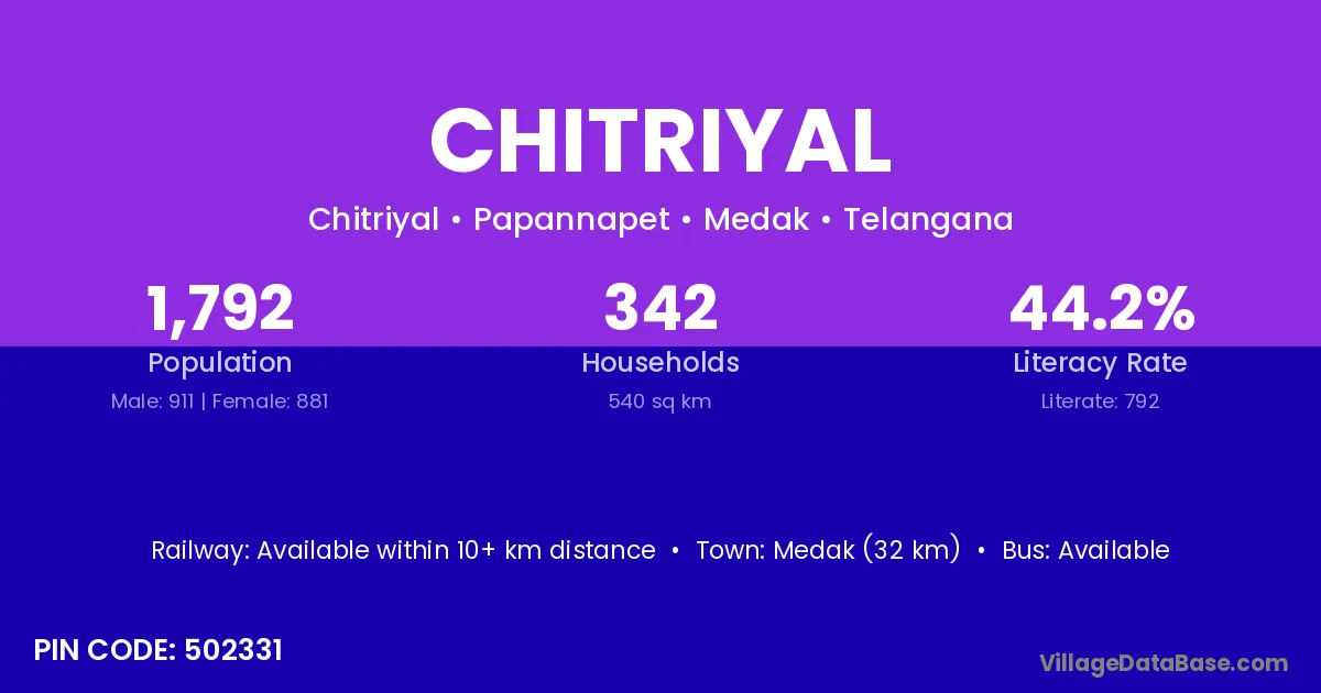 Medak (32 km) is the nearest town to Chitriyal village for major economic activities and is located approximately 32 km away.