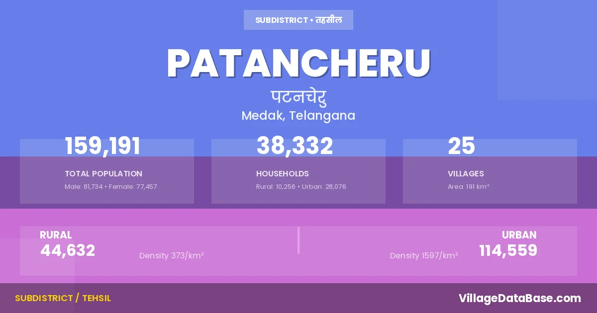 According to the 2011 census The total area of Patancheru Mandal is 191 km², with a population of 159191 people. The population density is 832 inhabitants per square kilometre, and there are approximately 38332 houses in the sub district.