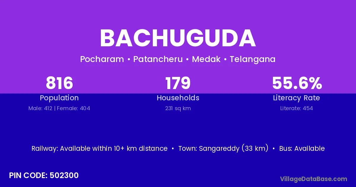 Sangareddy (33 km) is the nearest town to Bachuguda village for major economic activities and is located approximately 33 km away.