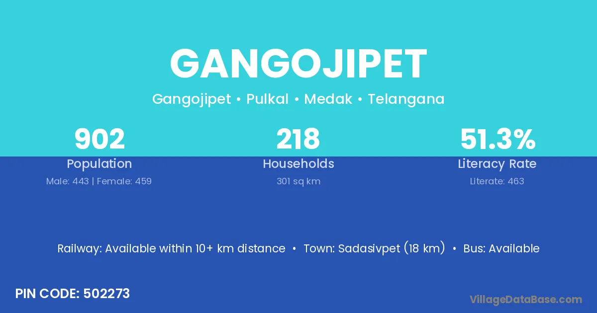 Sadasivpet (18 km) is the nearest town to Gangojipet village for major economic activities and is located approximately 18 km away.