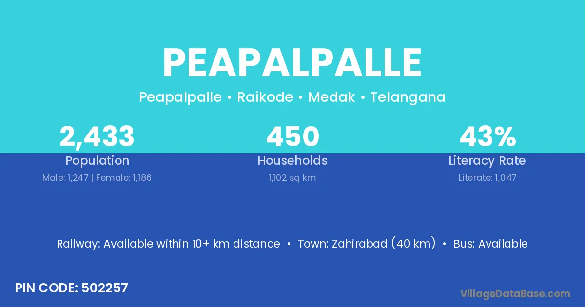 Zahirabad (40 km) is the nearest town to Peapalpalle village for major economic activities and is located approximately 40 km away.