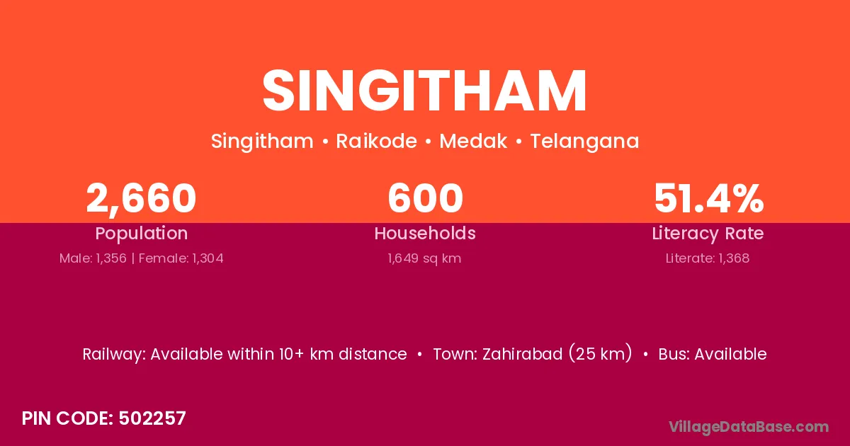 Zahirabad (25 km) is the nearest town to Singitham village for major economic activities and is located approximately 25 km away.
