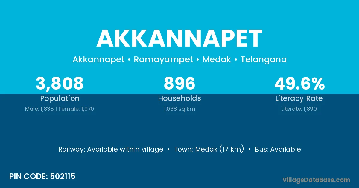 Akkannapet village has a total population of 3,808 people, of which 1,838 are males and 1,970 are females.