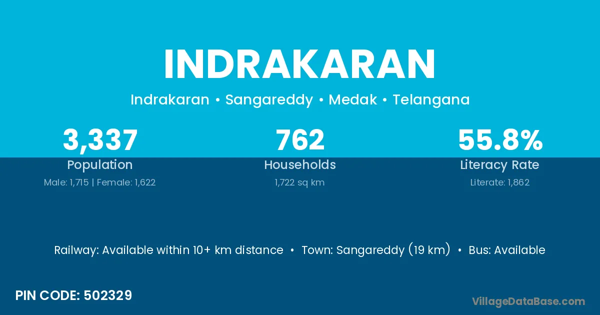 Sangareddy (19 km) is the nearest town to Indrakaran village for major economic activities and is located approximately 19 km away.