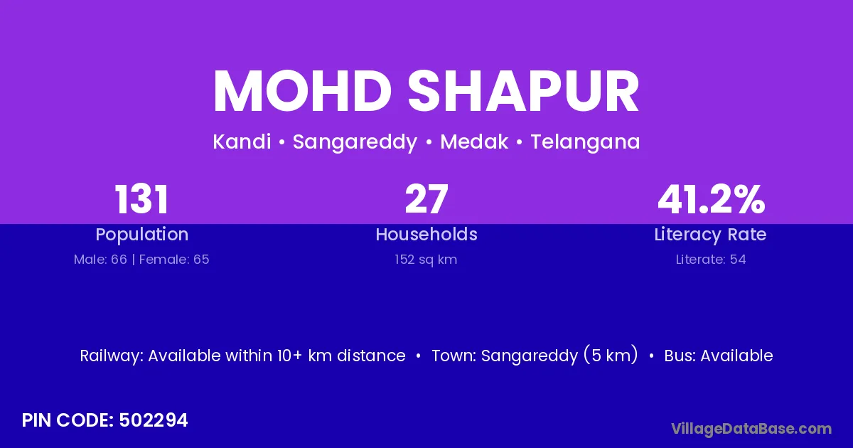 Sangareddy (5 km) is the nearest town to Mohd Shapur village for major economic activities and is located approximately 5 km away.