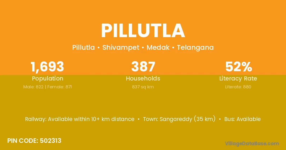 Sangareddy (35 km) is the nearest town to Pillutla village for major economic activities and is located approximately 35 km away.