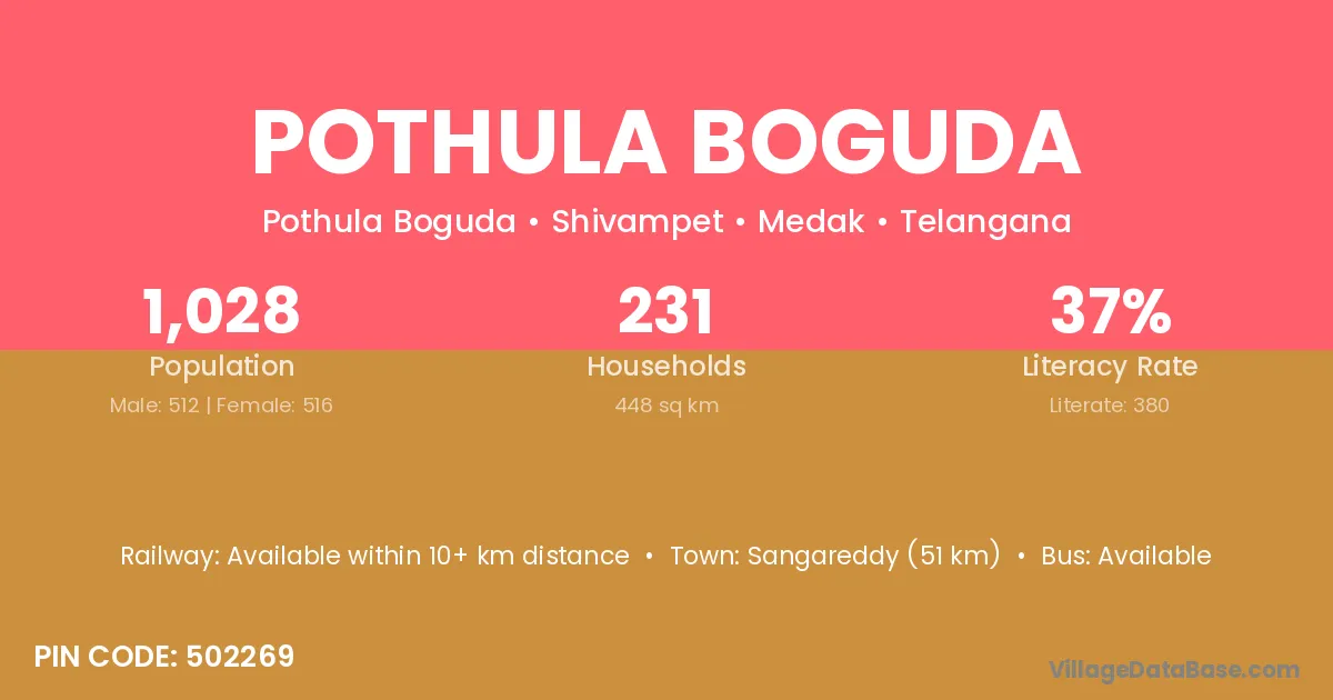 Sangareddy (51 km) is the nearest town to Pothula Boguda village for major economic activities and is located approximately 51 km away.