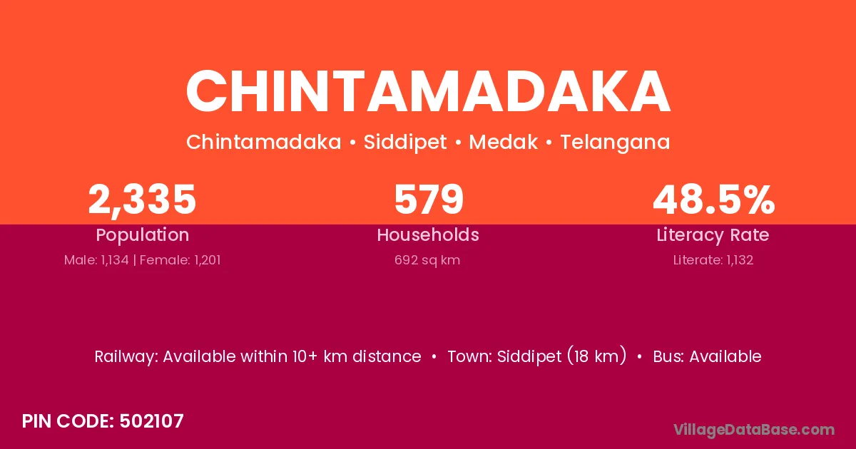 Siddipet (18 km) is the nearest town to Chintamadaka village for major economic activities and is located approximately 18 km away.