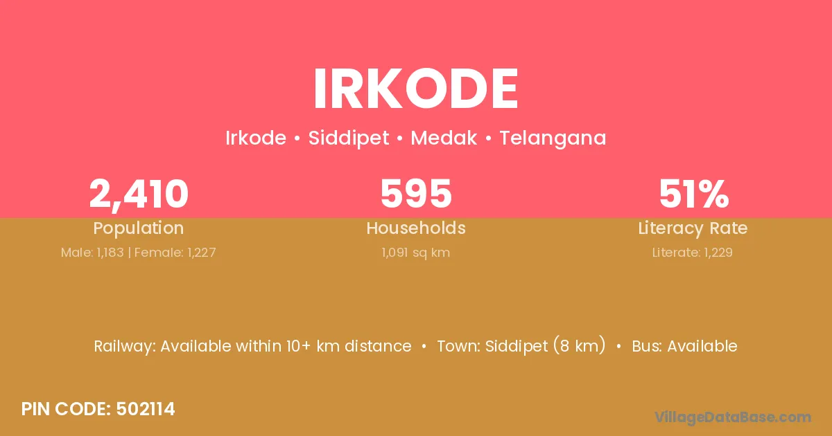 Siddipet (8 km) is the nearest town to Irkode village for major economic activities and is located approximately 8 km away.