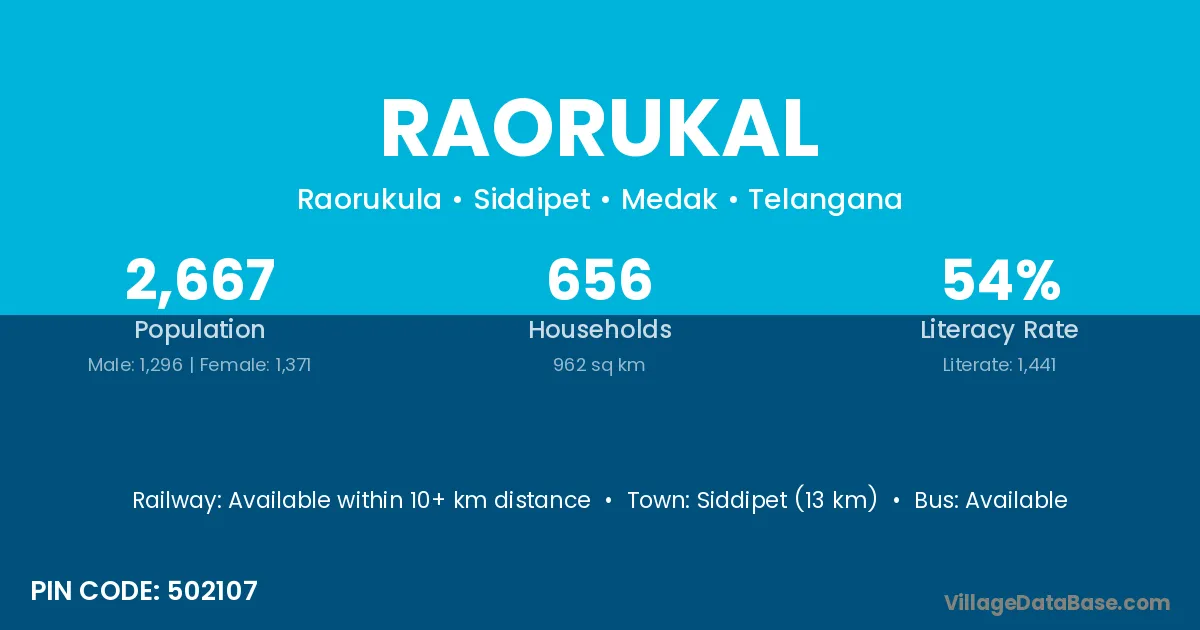 Siddipet (13 km) is the nearest town to Raorukal village for major economic activities and is located approximately 13 km away.
