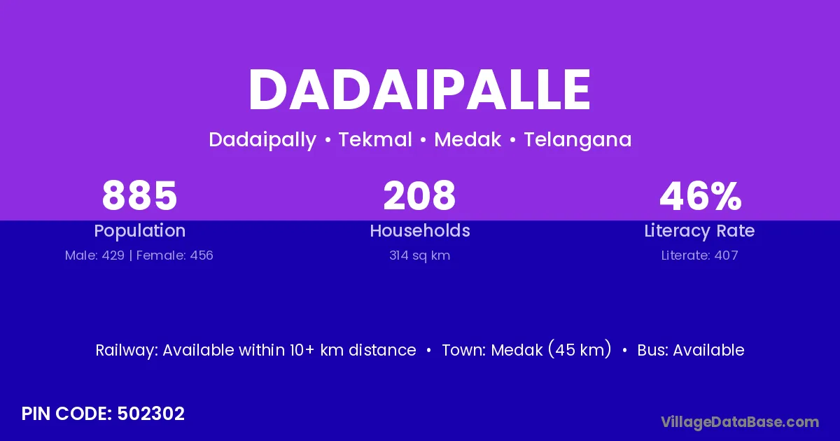 Medak (45 km) is the nearest town to Dadaipalle village for major economic activities and is located approximately 45 km away.