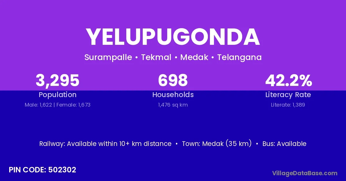 Medak (35 km) is the nearest town to Yelupugonda village for major economic activities and is located approximately 35 km away.