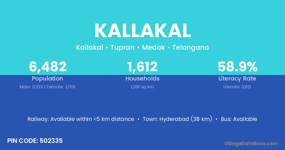 Kallakal village has a total population of 6,482 people, of which 3,323 are males and 3,159 are females.