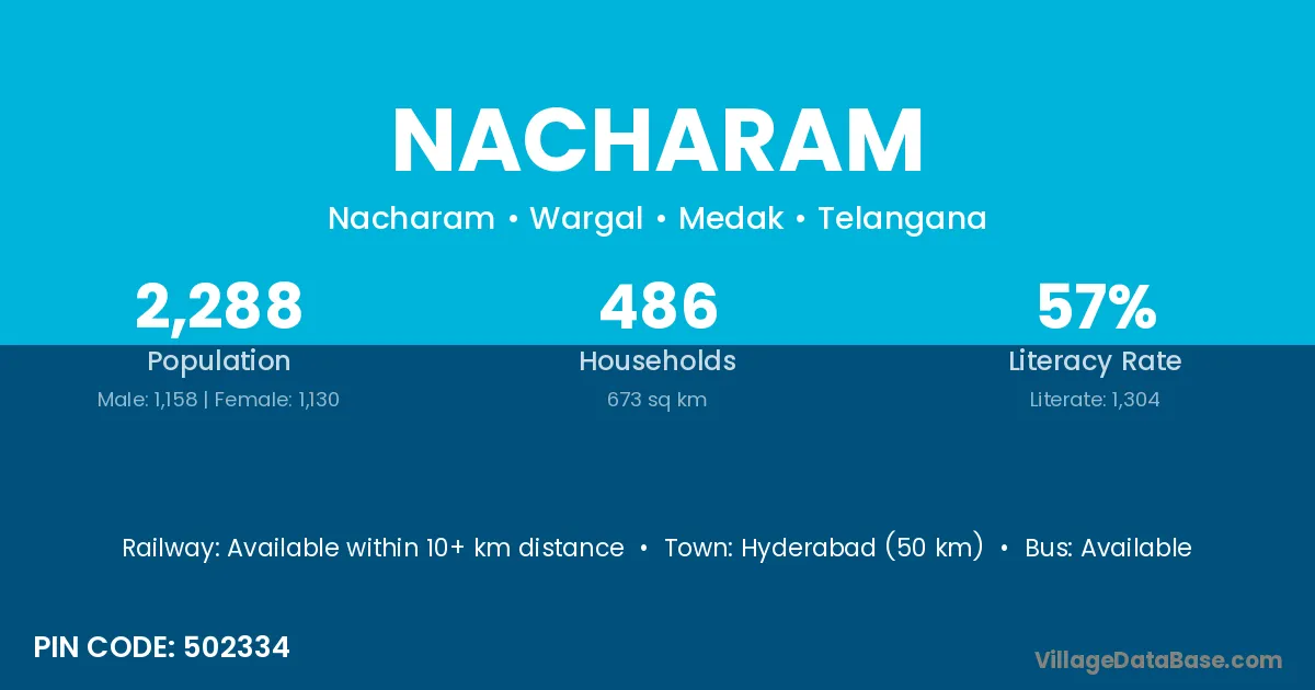 Nacharam village has a total population of 2,288 people, of which 1,158 are males and 1,130 are females.