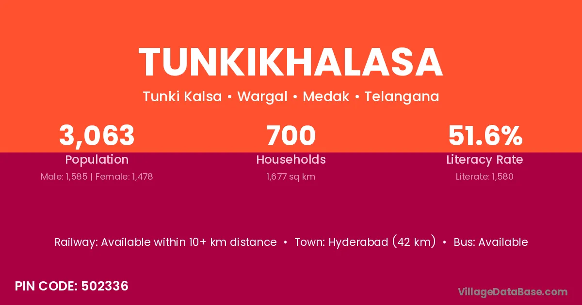 Hyderabad (42 km) is the nearest town to Tunkikhalasa village for major economic activities and is located approximately 42 km away.