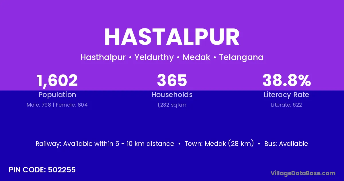 Medak (28 km) is the nearest town to Hastalpur village for major economic activities and is located approximately 28 km away.
