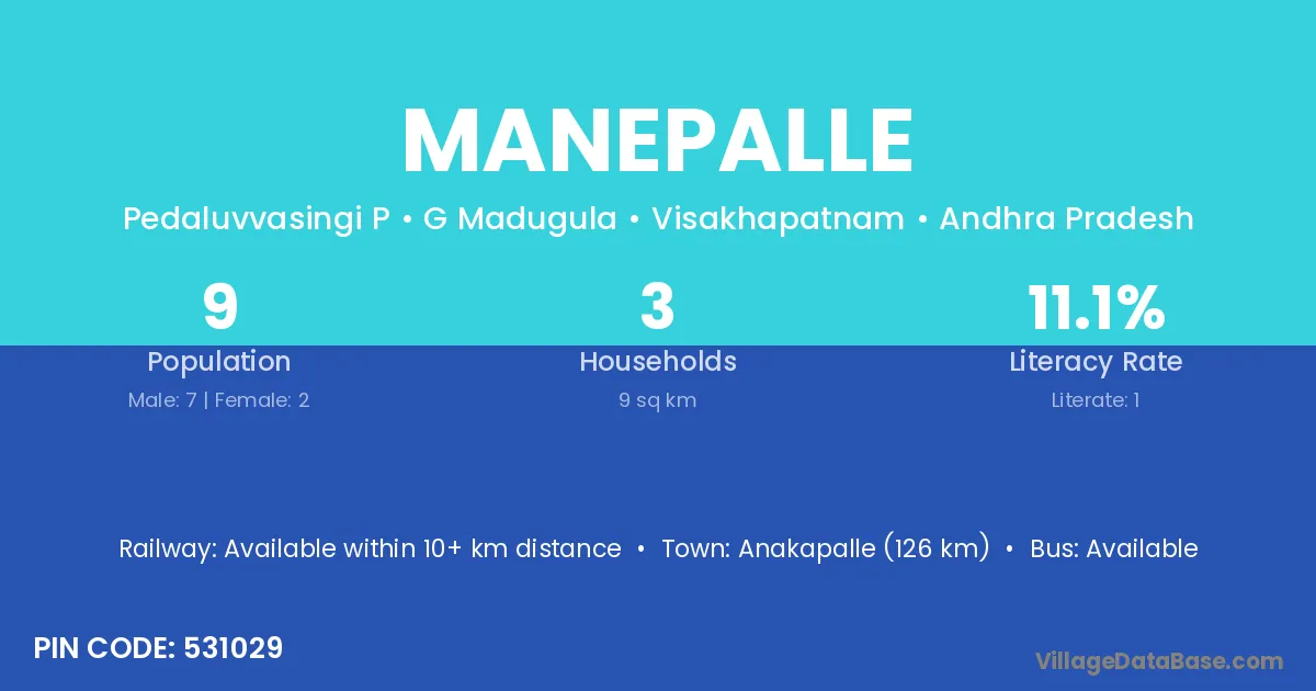 The literacy rate of Manepalle village is 44.05%. Male literacy stands at 54.05% and female literacy at 34.11%.