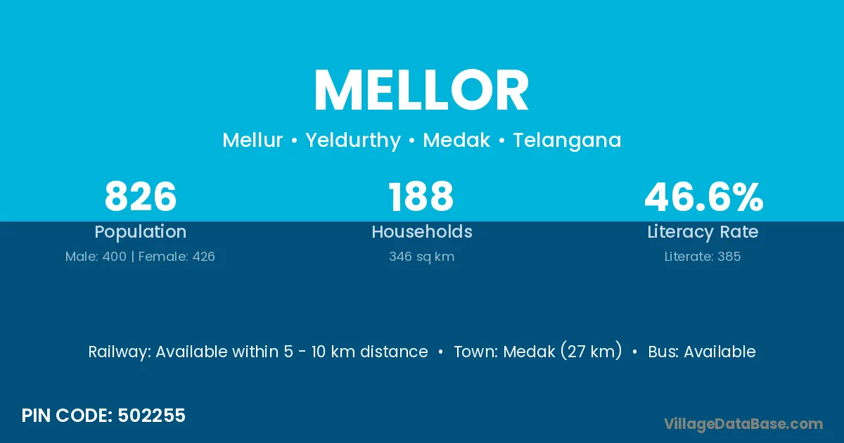 Medak (27 km) is the nearest town to Mellor village for major economic activities and is located approximately 27 km away.