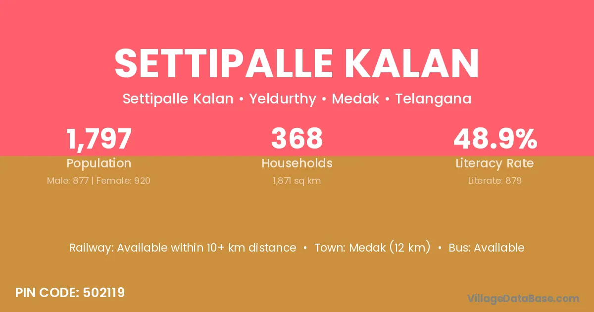 Medak (12 km) is the nearest town to Settipalle Kalan village for major economic activities and is located approximately 12 km away.