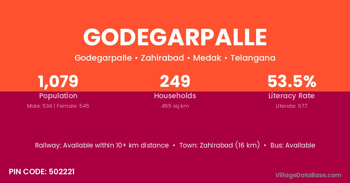 Zahirabad (16 km) is the nearest town to Godegarpalle village for major economic activities and is located approximately 16 km away.