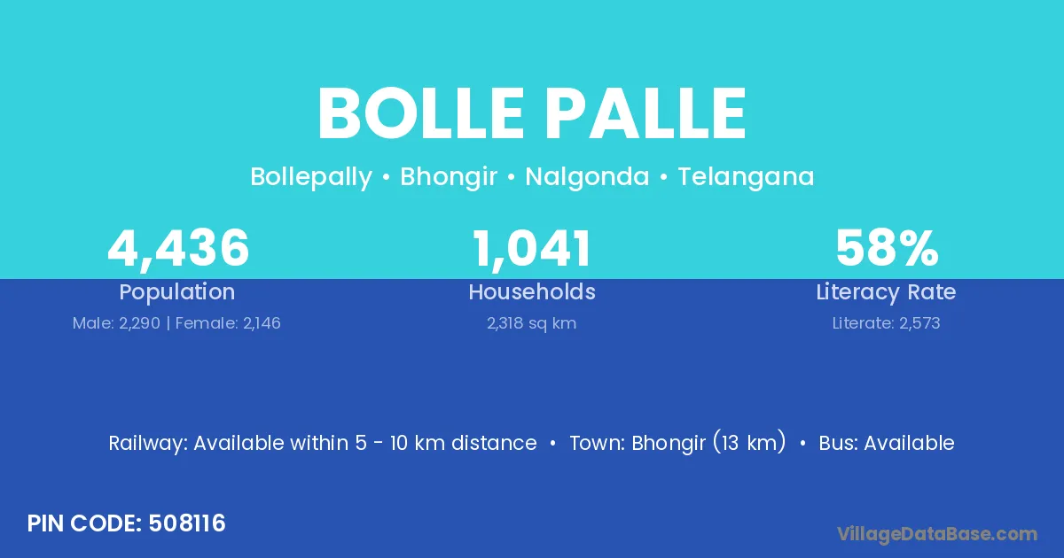 Bhongir (13 km) is the nearest town to Bolle Palle village for major economic activities and is located approximately 13 km away.