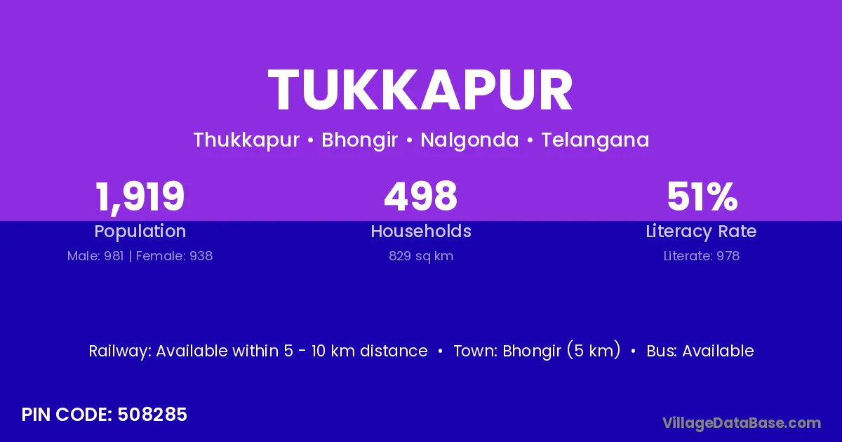 Bhongir (5 km) is the nearest town to Tukkapur village for major economic activities and is located approximately 5 km away.