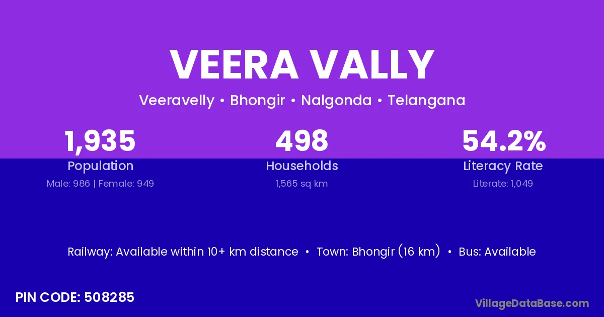 Bhongir (16 km) is the nearest town to Veera Vally village for major economic activities and is located approximately 16 km away.