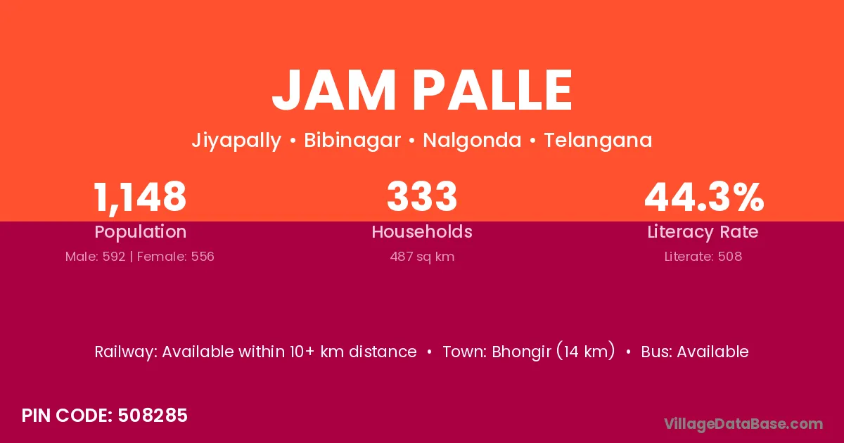 Bhongir (14 km) is the nearest town to Jam Palle village for major economic activities and is located approximately 14 km away.