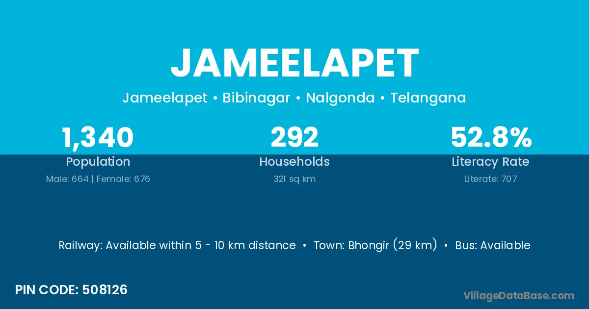 Bhongir (29 km) is the nearest town to Jameelapet village for major economic activities and is located approximately 29 km away.