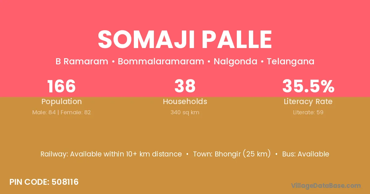 Bhongir (25 km) is the nearest town to Somaji Palle village for major economic activities and is located approximately 25 km away.