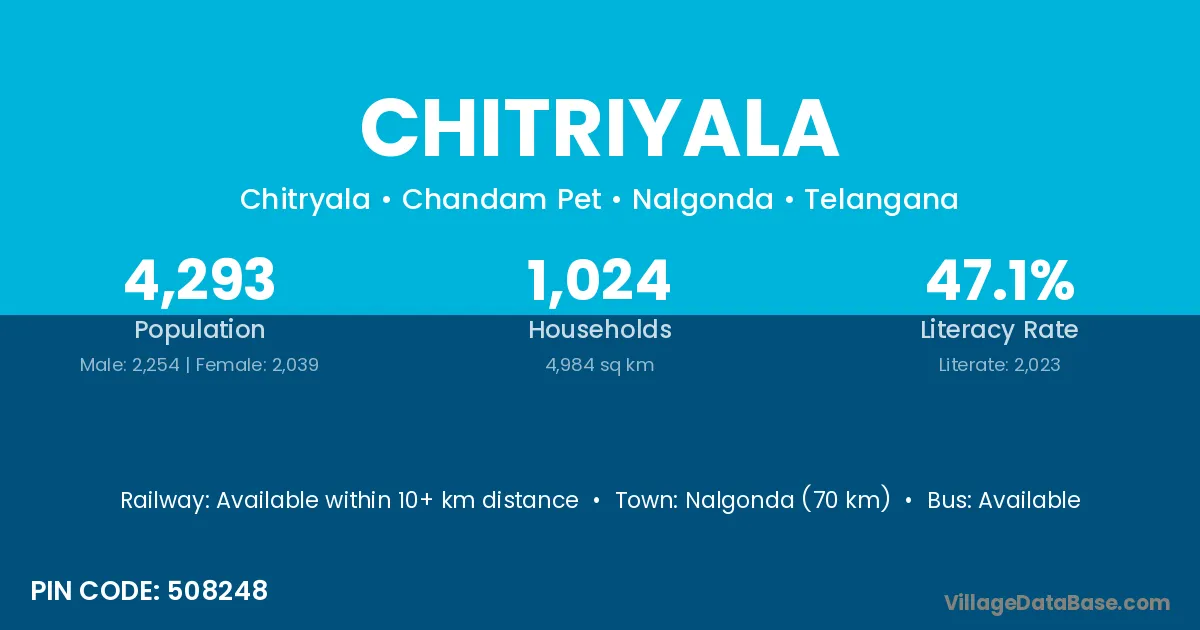 Nalgonda (70 km) is the nearest town to Chitriyala village for major economic activities and is located approximately 70 km away.