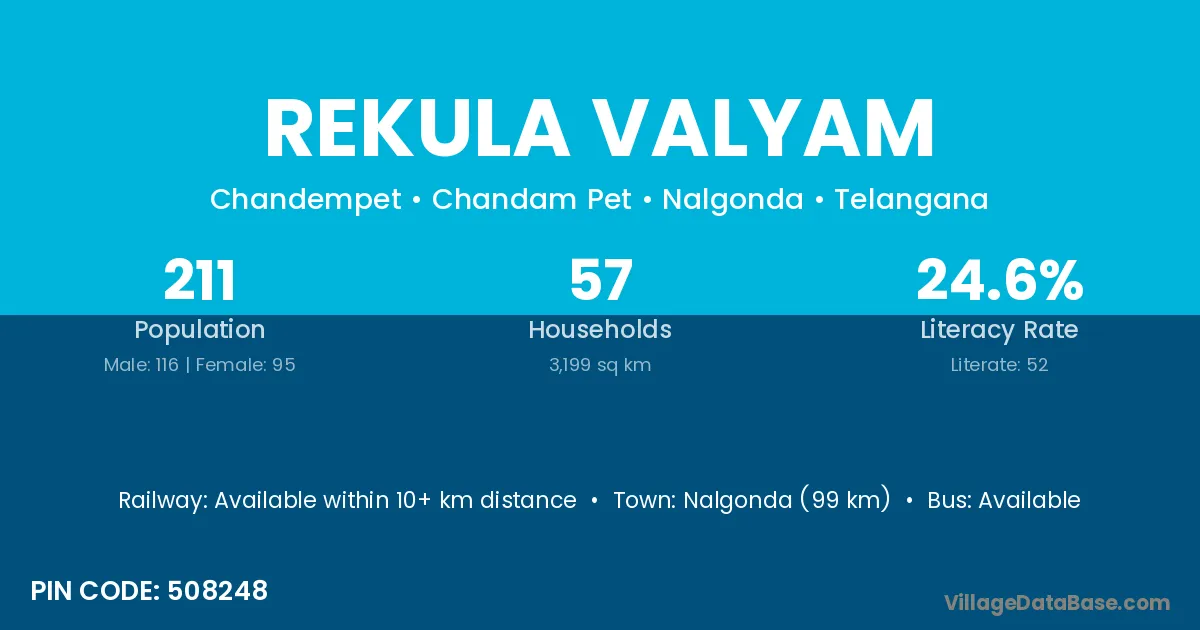 Nalgonda (99 km) is the nearest town to Rekula Valyam village for major economic activities and is located approximately 99 km away.