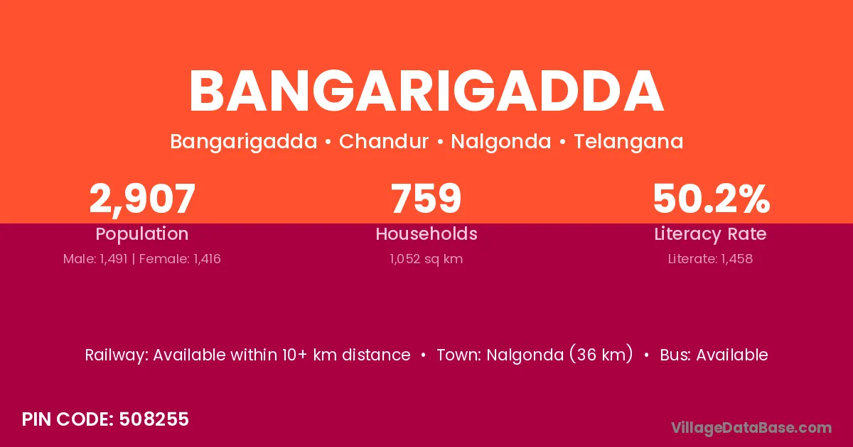 Nalgonda (36 km) is the nearest town to Bangarigadda village for major economic activities and is located approximately 36 km away.