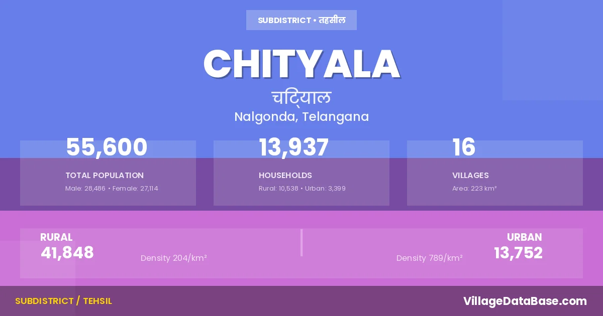 According to the 2011 census The total area of Chityala Mandal is 223 km², with a population of 55600 people. The population density is 250 inhabitants per square kilometre, and there are approximately 13937 houses in the sub district.