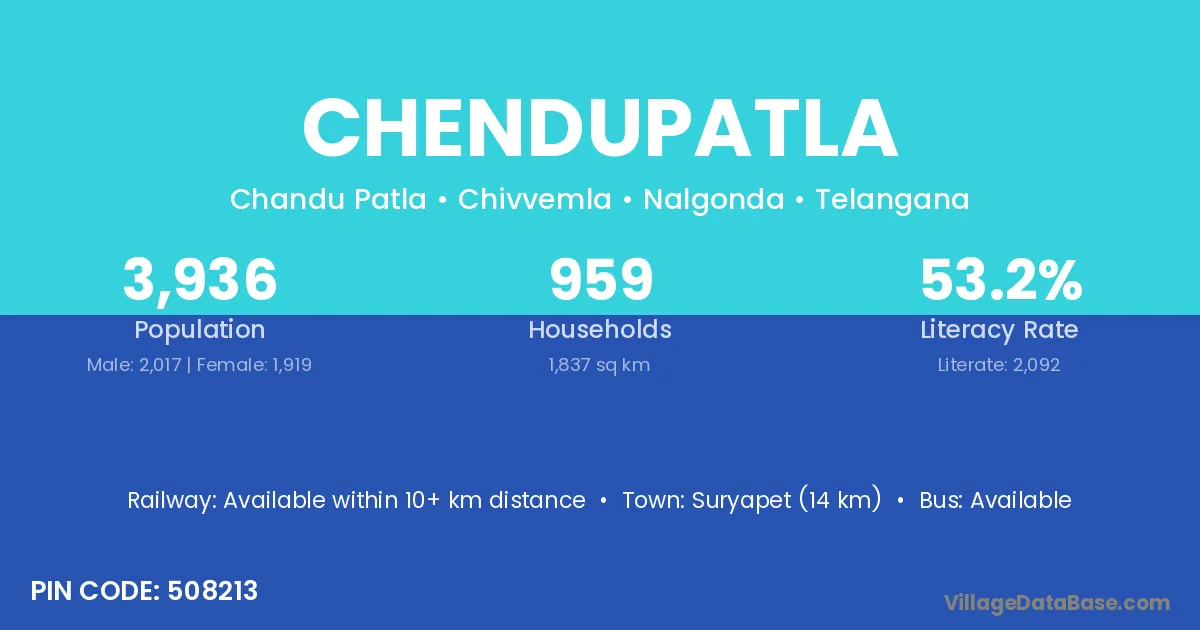 Suryapet (14 km) is the nearest town to Chendupatla village for major economic activities and is located approximately 14 km away.