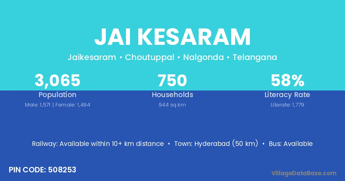 Hyderabad (50 km) is the nearest town to Jai Kesaram village for major economic activities and is located approximately 50 km away.