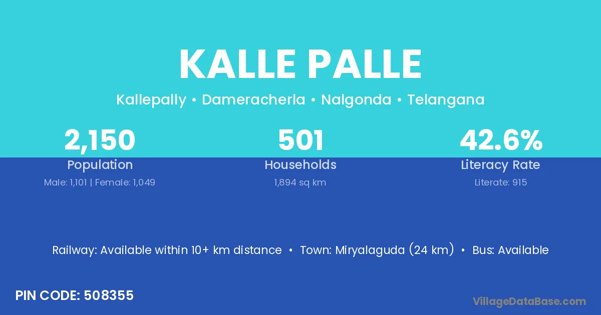Miryalaguda (24 km) is the nearest town to Kalle Palle village for major economic activities and is located approximately 24 km away.